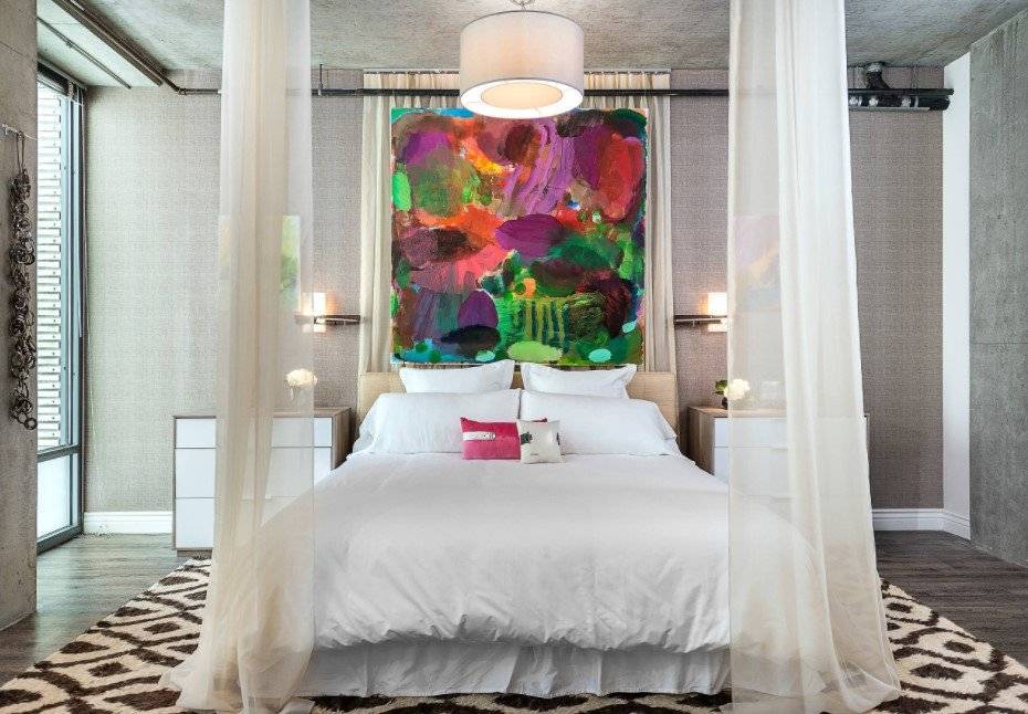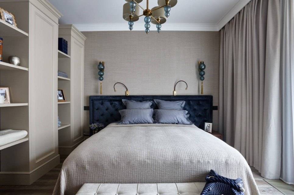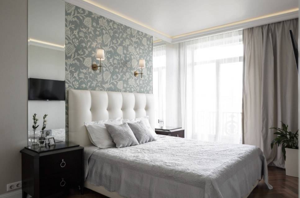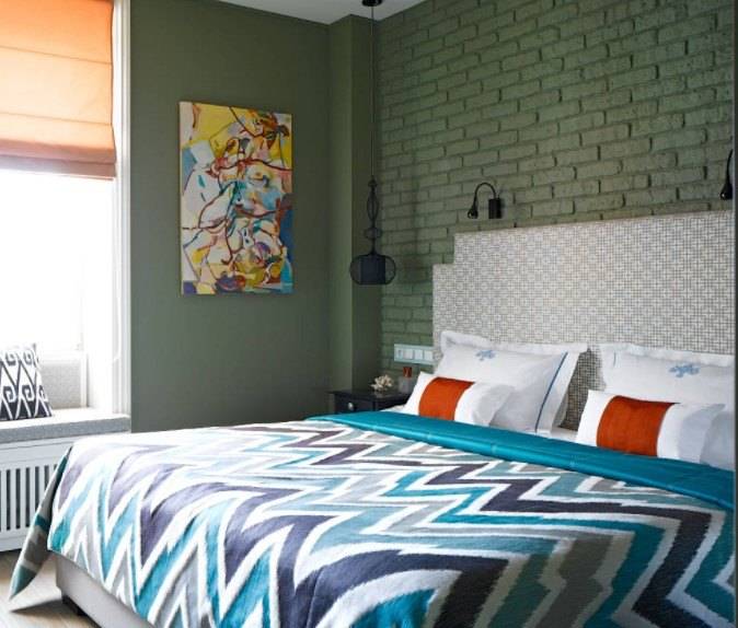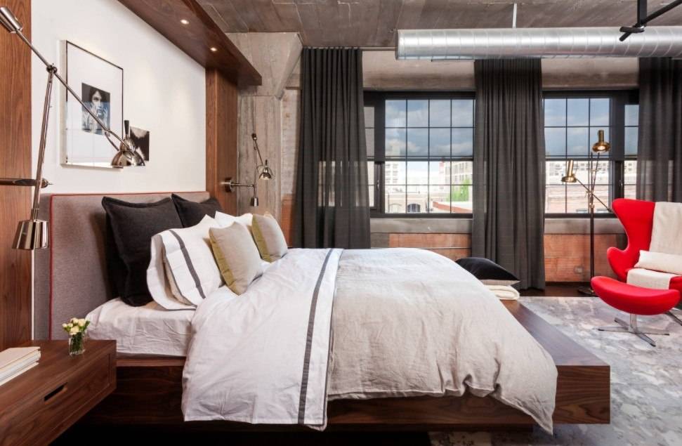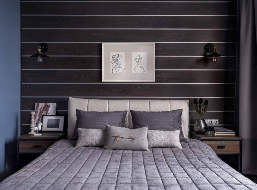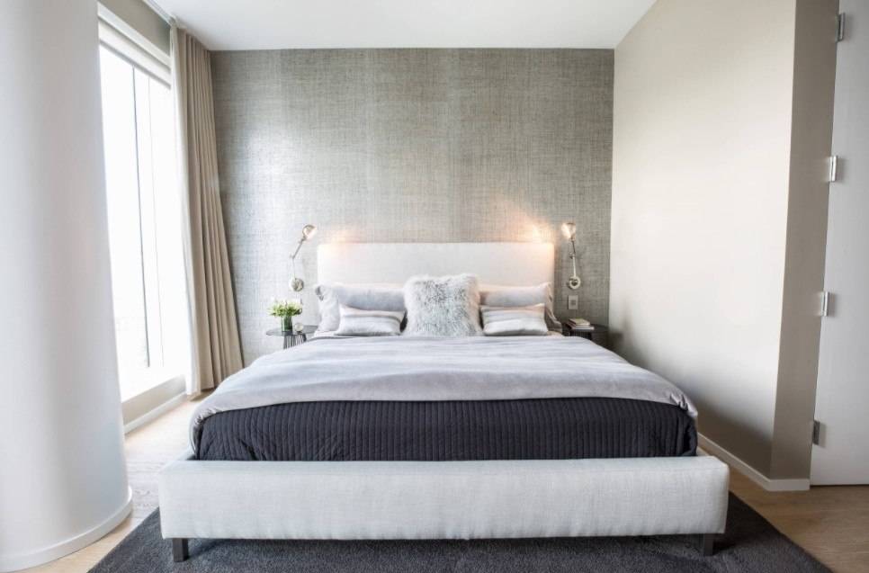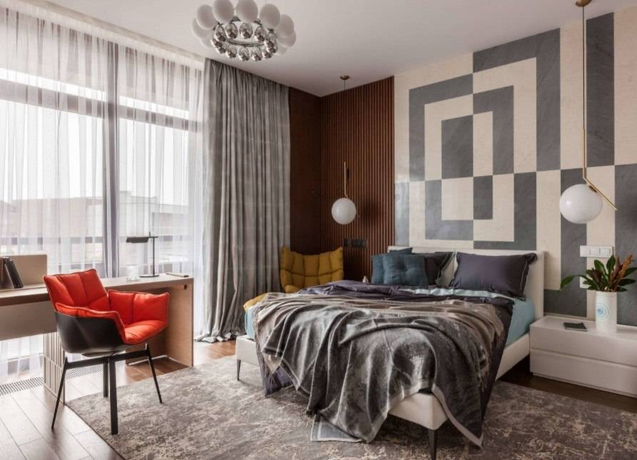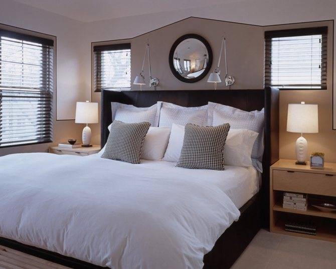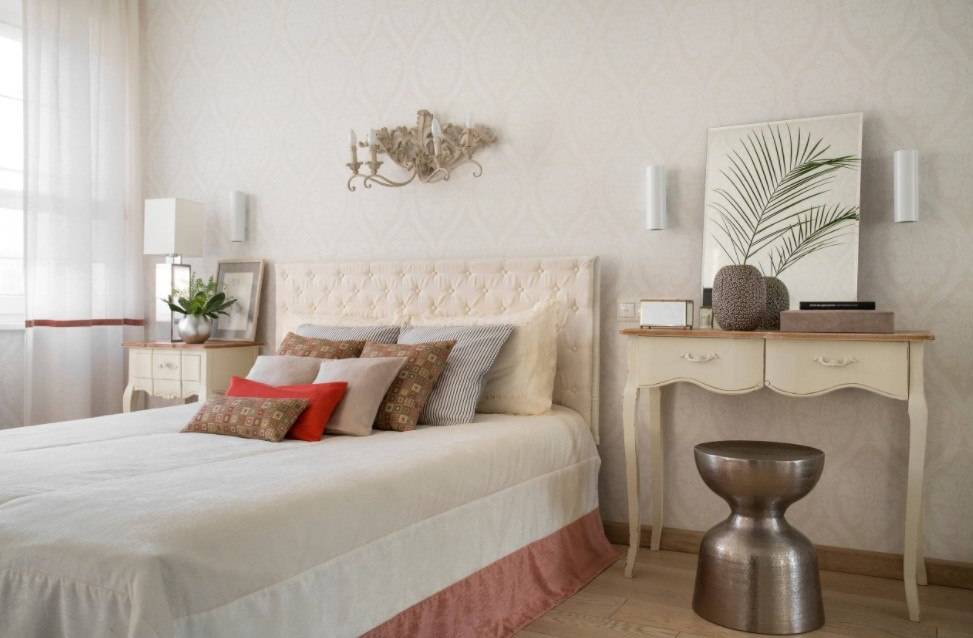 В этом случае стоит уделить внимание оформлению стены за изголовьем, а также расположению других предметов мебели и декора.