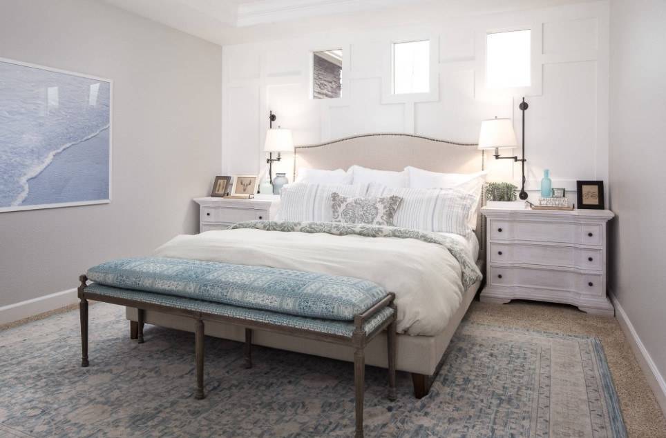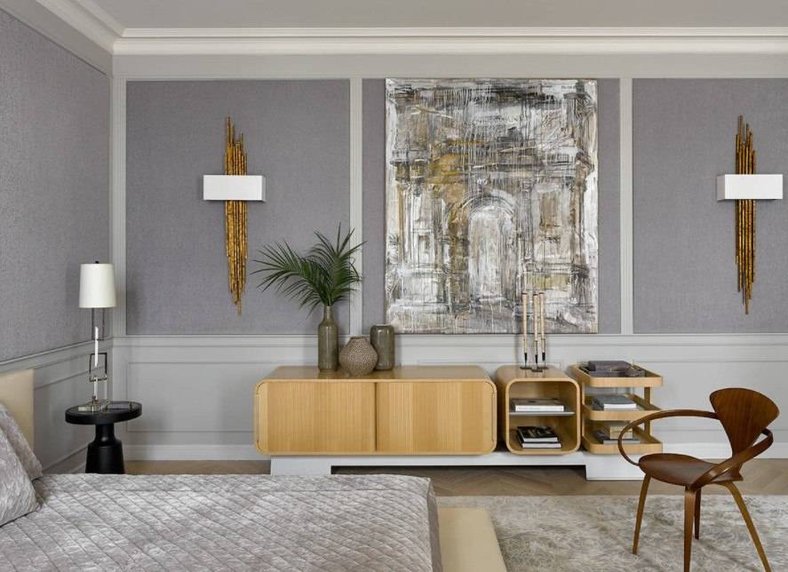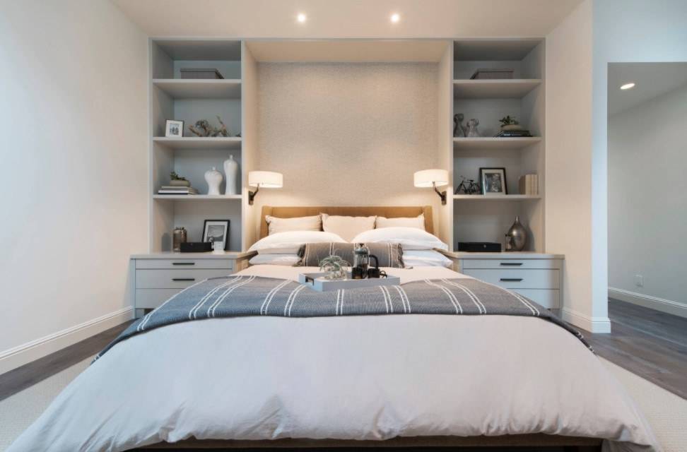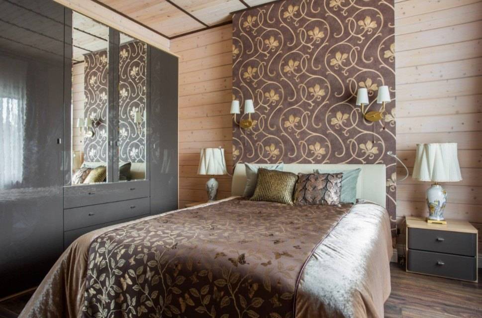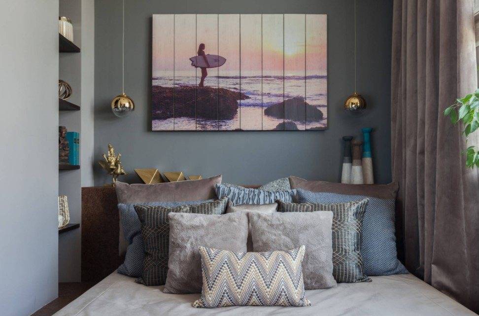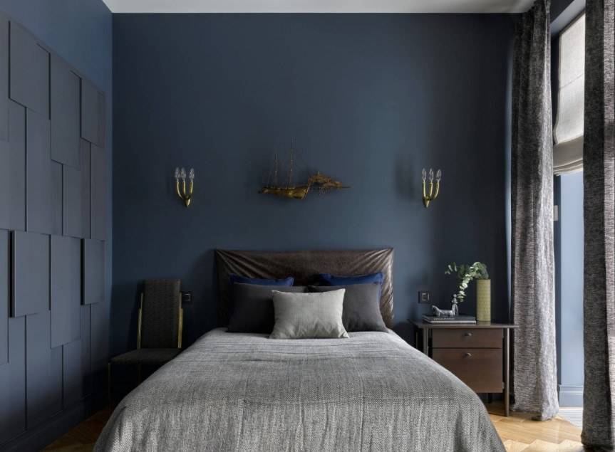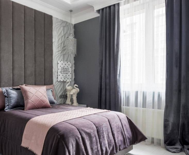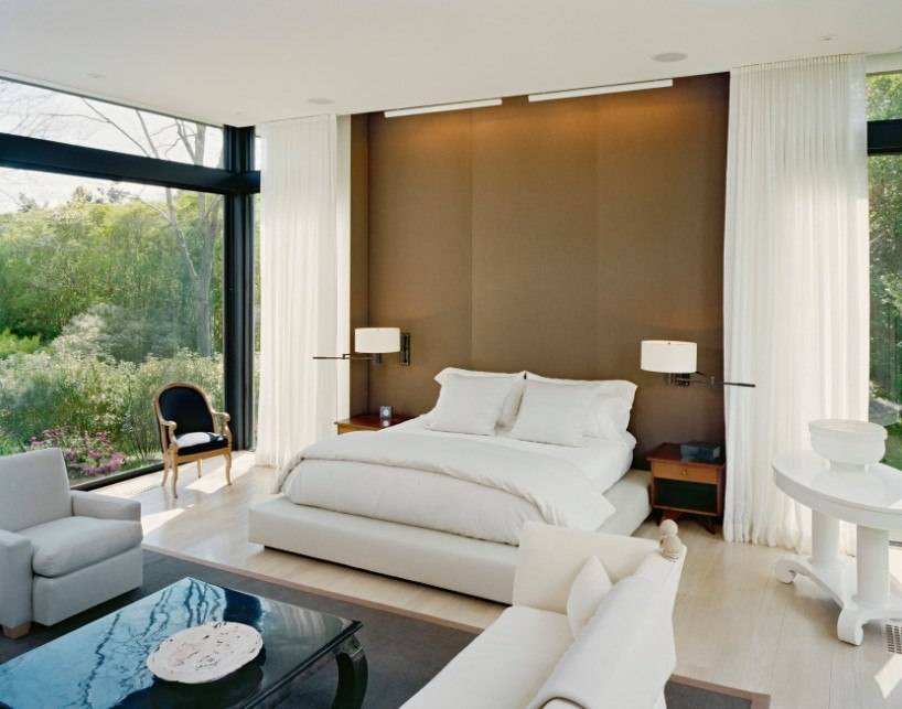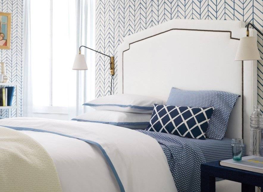 В этом случае стоит уделить внимание оформлению стены за изголовьем, а также расположению других предметов мебели и декора.