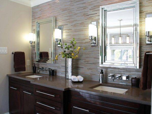 Некоторые дизайнерские решения предусматривают наличие множества маленьких плафонов по обе стороны зеркала. В этом случае приборы освещения устанавливают симметрично.