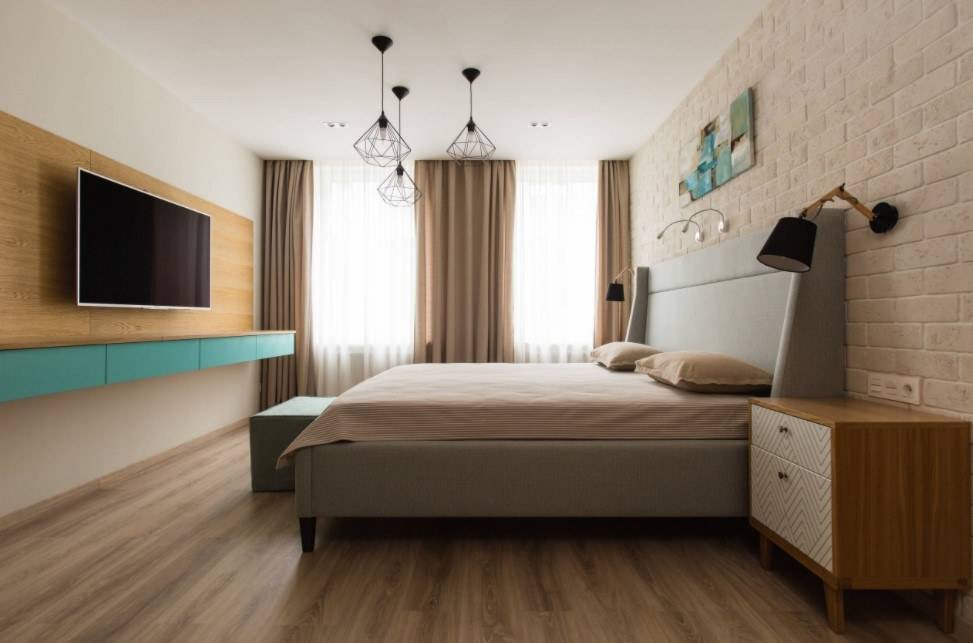 Смонтировать люстру на расстоянии от кровати не сложно в просторной спальне. Однако в условиях ограниченного пространства можно решить задачу альтернативными путями.