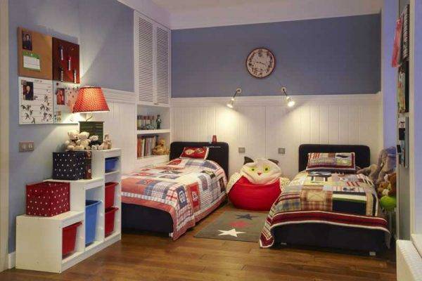 Детский участок лучше расположить дальше от входа в комнату, чтобы не беспокоить ребенка ночью, если надо выйти. Как именно будет разделено помещение, зависит от возраста малыша. Когда он совсем маленький, четкое разделение не обязательно. Можно воспользоваться методом применения обоев разных цветов. К этому добавляются светильники, ковровые покрытия для пола и стен. Например, в детской области рекомендуется расположить мягкие коврики.