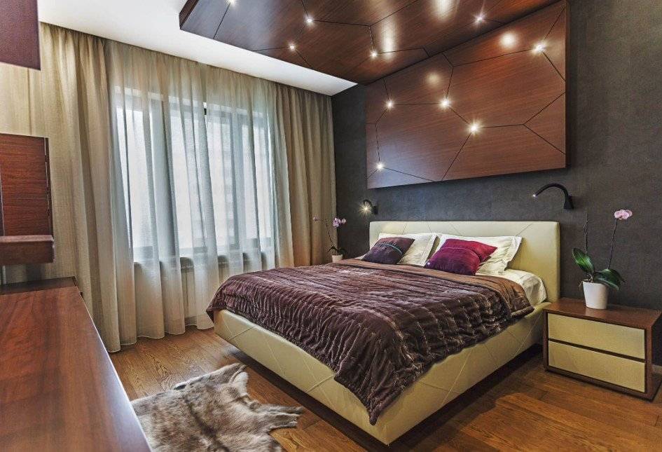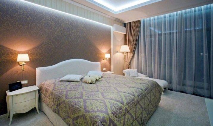 - Двухъярусный потолок, центральная часть которого выполнена в виде окружности. По линии круга установлены точечные светильники. В центре монтируется крупная люстра с подвесками. В прикроватной зоне установлены плоские светильники-ночники.