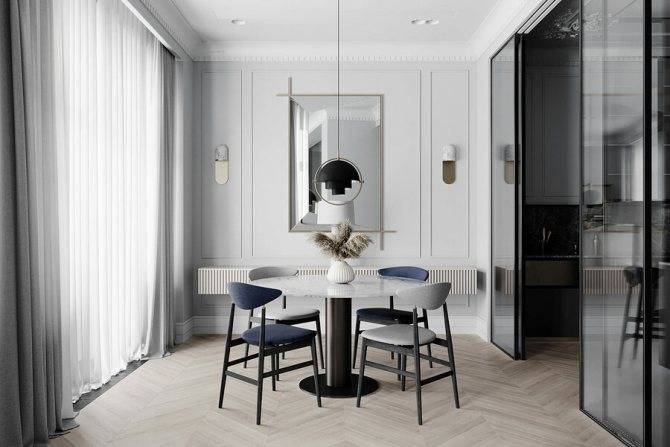 В обеденной зоне уместно повесить один, два или более настенных светильников для создания качественного освещения обеденного стола. Количество приборов будет зависеть от размеров стола, а оптимальная высота их размещения составляет 70-80 см от поверхности стола.