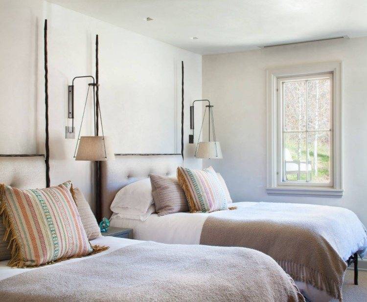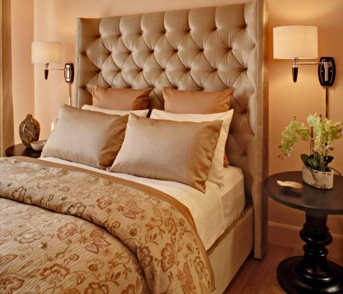 - Высота спинки кровати. Светильник должен располагаться в 20-30 см над спинкой. Однако здесь речь идет о стандартном изголовье. Иногда эта деталь настолько высока, что лампу не получается установить даже на 160-сантиметровой высоте. Поступить следует так: подвесить светильник чуть выше края спинки, оснастив его шнурком. Можно не вешать лампу выше кровати, а вмонтировать ее прямо в спинку.