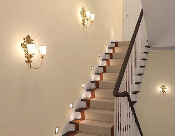 Лестницы на второй этаж почти всегда оснащены настенными осветительными приборами. Их нужно несколько для хорошей освещенности. Однако главное — не переусердствовать: светильники не должны создавать препятствий при движении. Лампочки следует располагать на уровне немного выше головы. Если такая возможность отсутствует — не ниже уровня плеч.