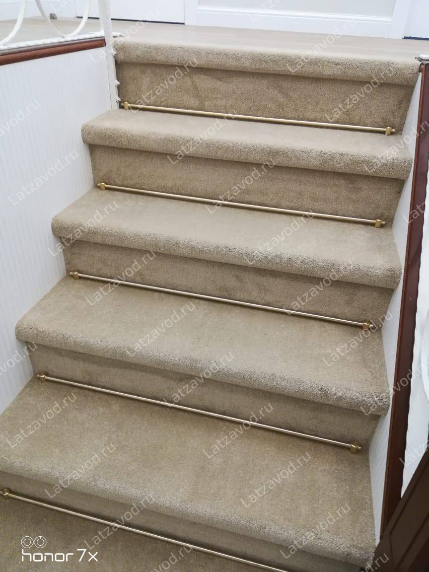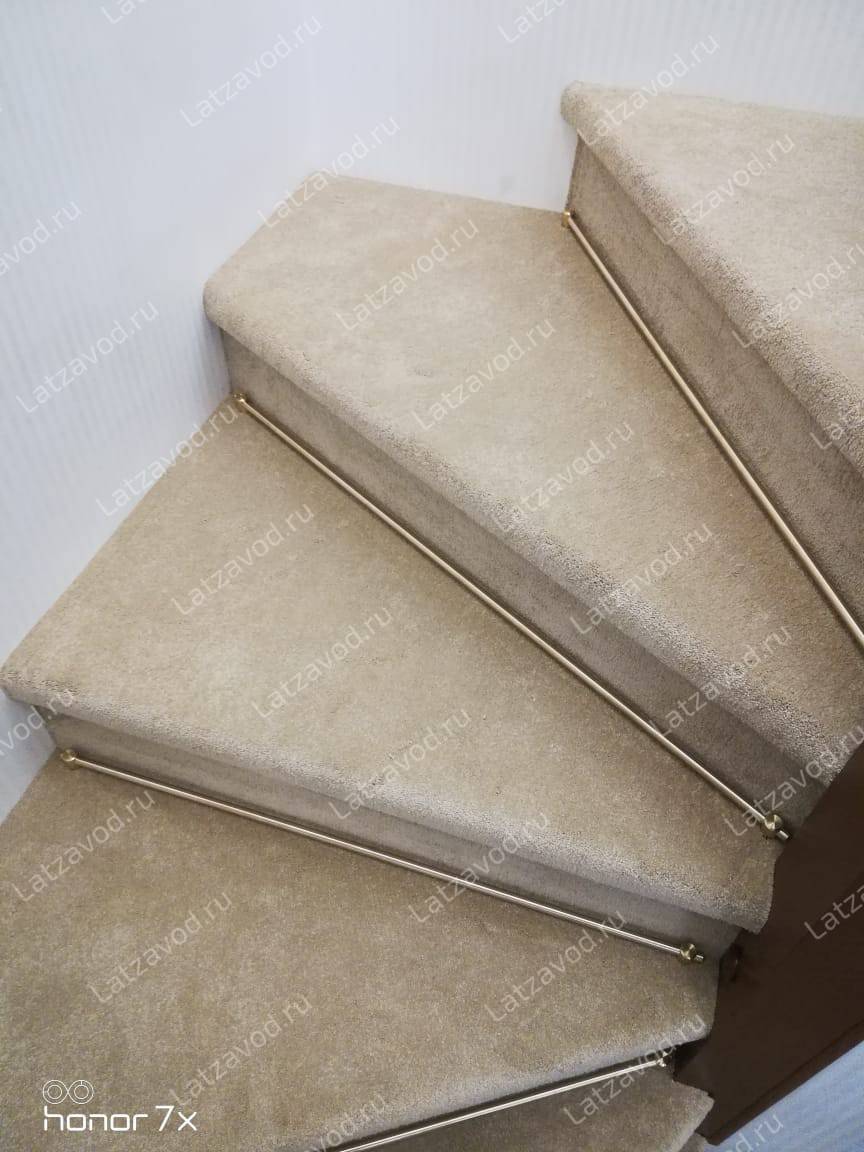 Самый доступный способ крепления ковролина к лестнице своими руками. Лучше всего подходит для ступенек широких лестниц. Лестница обшивается единым полотном, которое фиксируется по углам ступенек штангами. Затем штанги вставляются в специальные кольца.