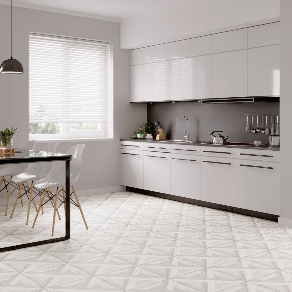 Наиболее часто используемые варианты совмещения различных покрытий на полу кухни: в рабочей зоне укладывают керамическую плитку или керамогранит, ламинат, линолеум, ПВХ плитки, а в зоне столовой настилают на выбор — паркетную доску, штучный паркет, ковролин, пробковый пол.