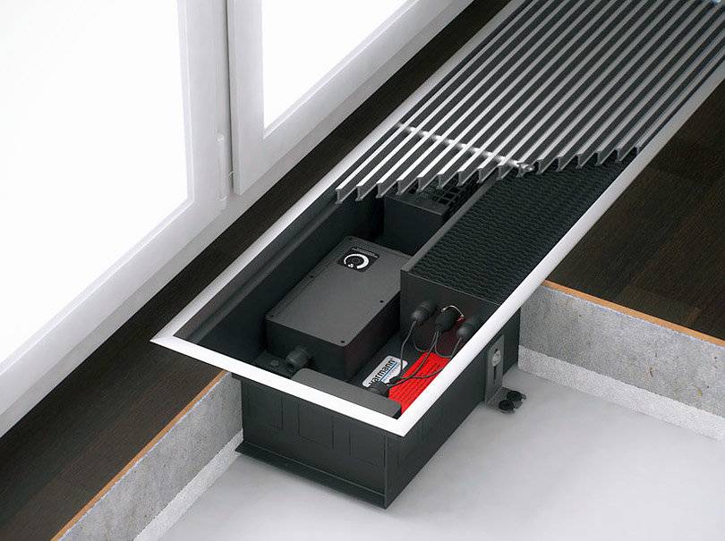 Встраиваемые батареи имеют очень простое устройство. Они состоят из металлического корпуса. В нем содержится нагревательный элемент, на котором закреплено множество конвективных ребер. Короб сверху защищен решеткой, располагающейся на уровне пола.
