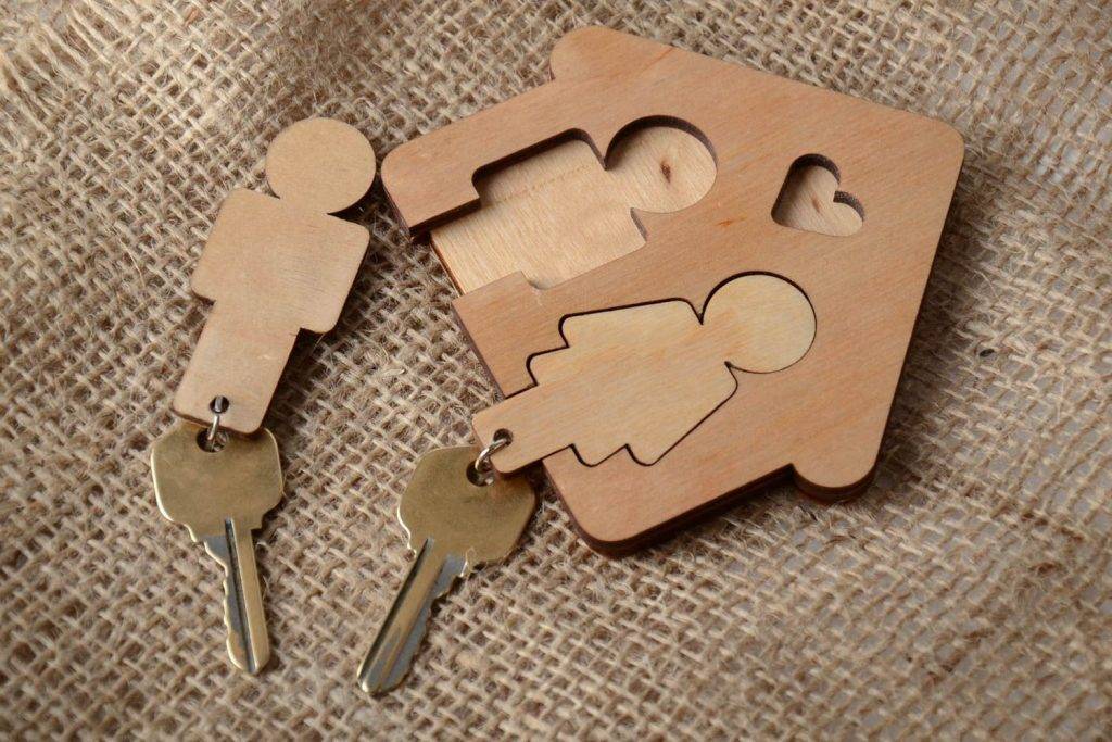 Двойная ключница с фамилией из фанеры: сначала выпиливается основная деталь, а затем уже мелкие элементы. Например небольшие деревянные фигурки, к которым крепится ключ. Фигурка выступает в роли брелка. Если кто-то из семьи выходит из дома-он берет с собой этот брелок с ключом. Если место пусто-значит дома не все.