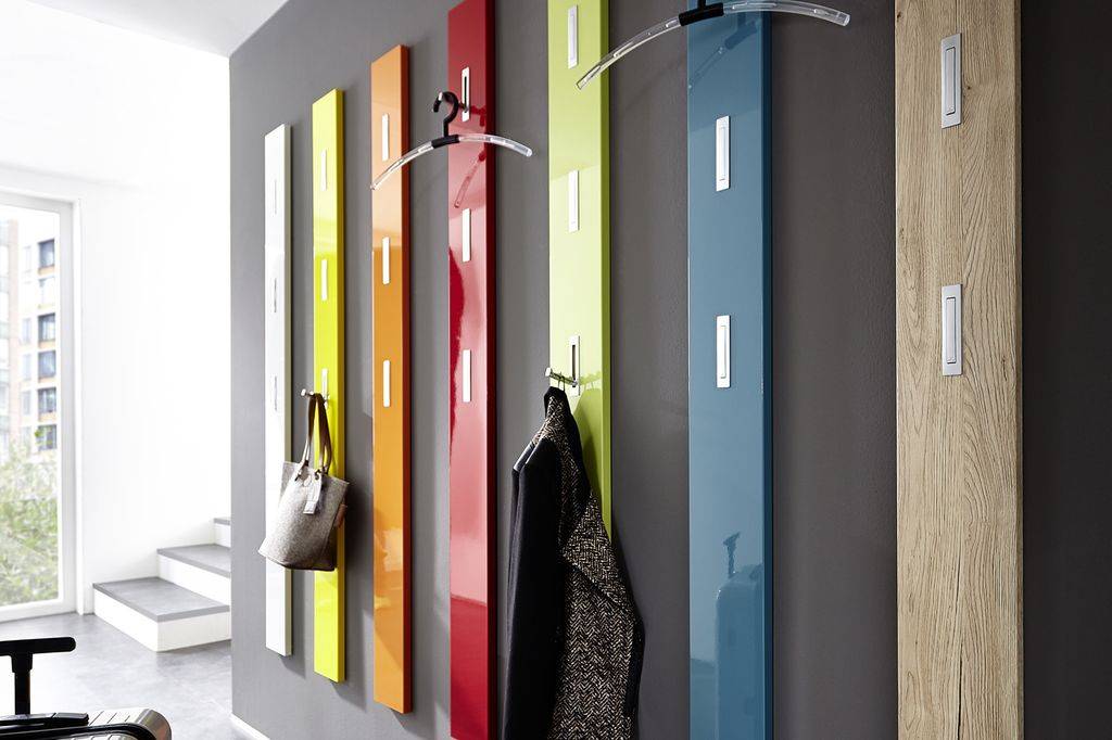 Настенный вешалки в прихожую являются самым популярным вариантом. Такие вешалки бывают двух видов: просто набор крючков, которые можно произвольно закрепить на стене и панели с уже прикрепленными крючками.