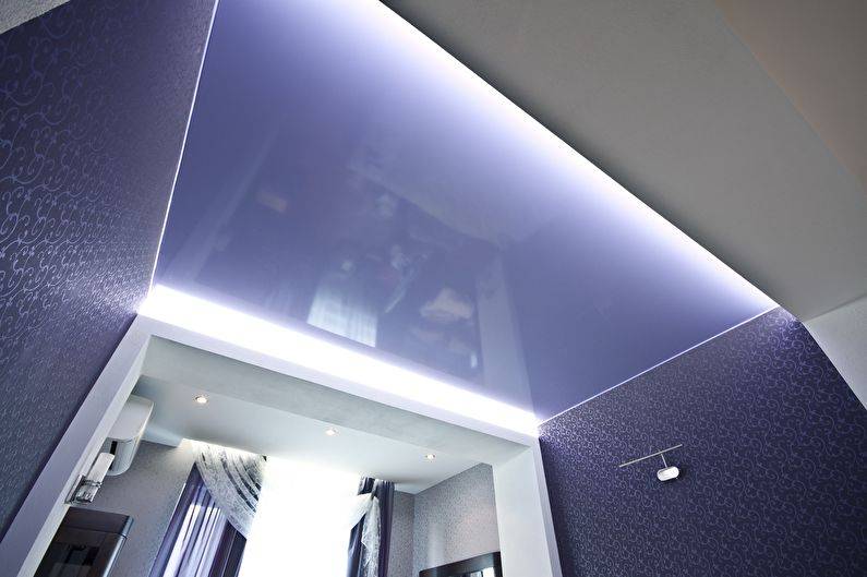 Глянцевый натяжной потолок — лучший выбор, если требуется визуально поднять высоту помещения и сделать его светлее. Независимо от цвета, такая пленка похожа на чистую водную гладь, в которой отражается каждый фотон освещения — как дневного, так и искусственного.
