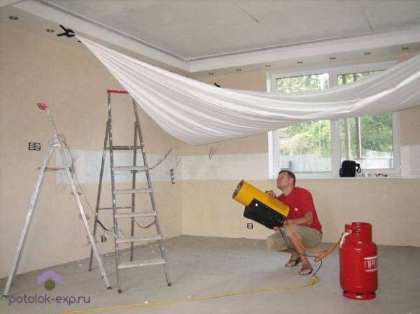 Тепловая пушка есть не у каждого. Ее покупка при разом выполнении работ нецелесообразна. В таком случае можно смонтировать натяжной потолок без нагрева полотна. В этом случае вместо пленки ПВХ используется ткань.