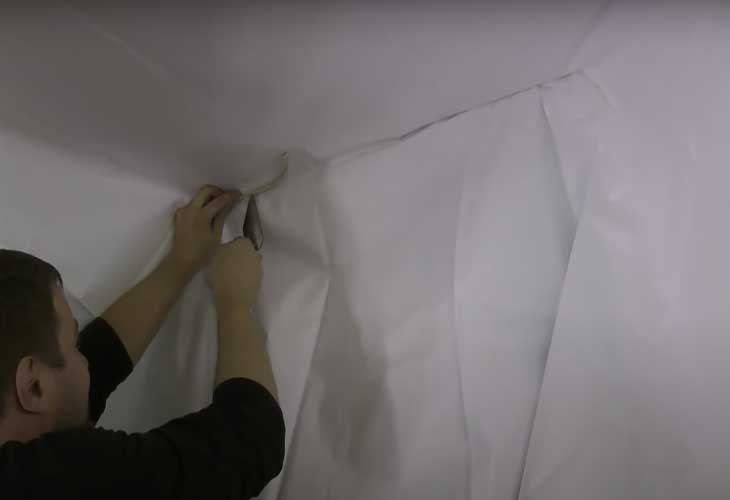 При установке потолка из ПВХ-пленки необходимо довести температуру помещения до 40–45 градусов. Рекомендуется перекрыть все возможные источники прохладного воздуха – окна, двери, вентиляционные решетки. Сквозняк и охлажденный воздух могут механически повредить мембрану, создавая на ней неровности, которые повлияют на свойства полотнища и усложнят процесс установки. Монтаж можно начинать, когда пленка будет равномерно гибкой и без заломов. Глубокие складки на пленке можно обработать тепловой пушкой или феном.