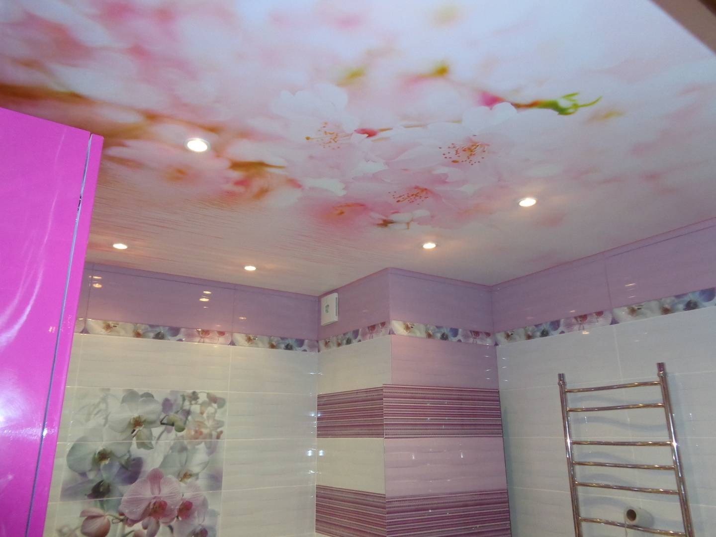 Варианты натяжных потолков с рисунком востребованы в ванной комнате