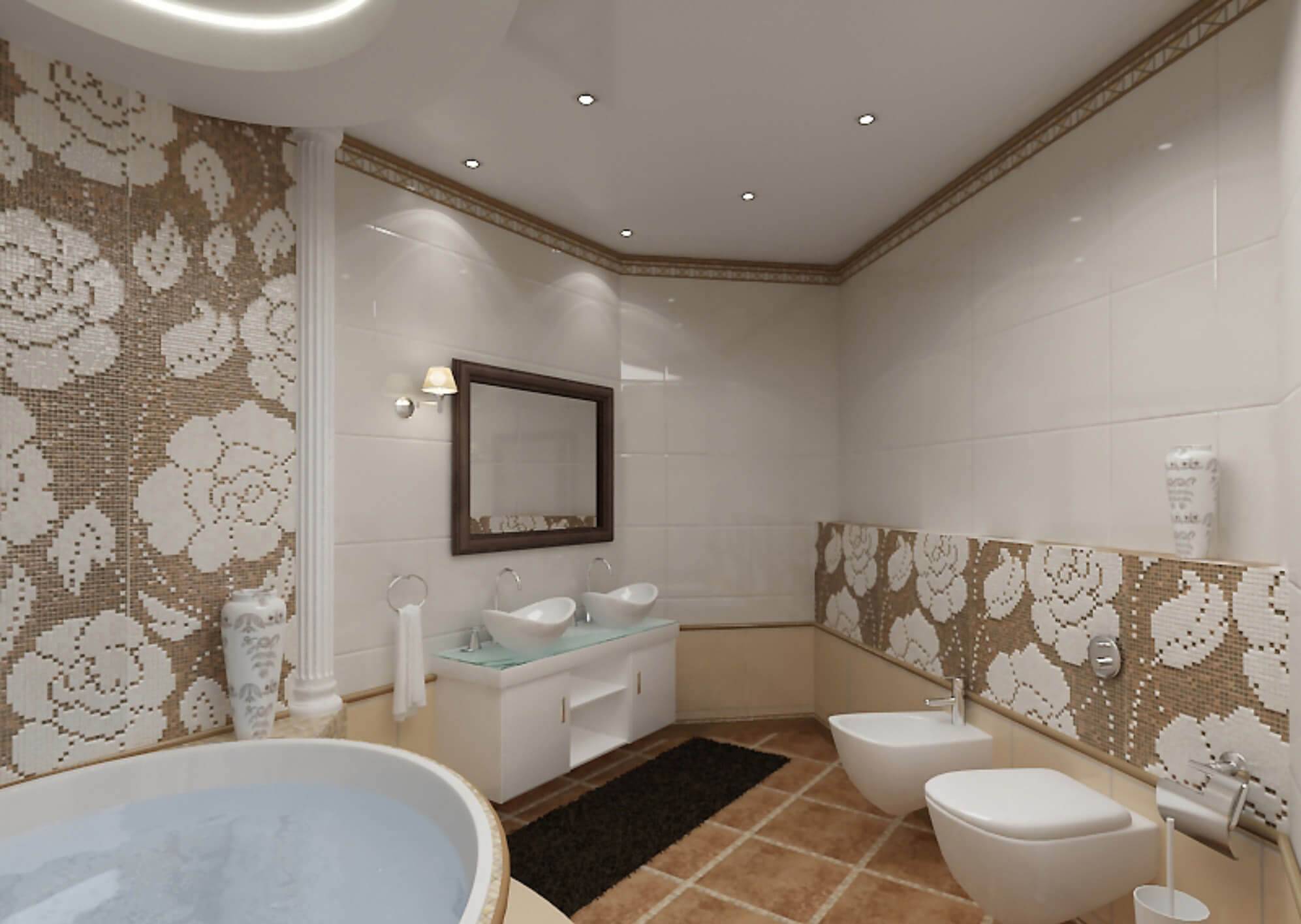 На потолке рисунок изменит весь интерьер ванной. Все станет выглядеть по-особенному, создается удивительное ощущение. Очаровательно смотрится цветочный орнамент. Любимые букеты цветов будут всегда рядом.