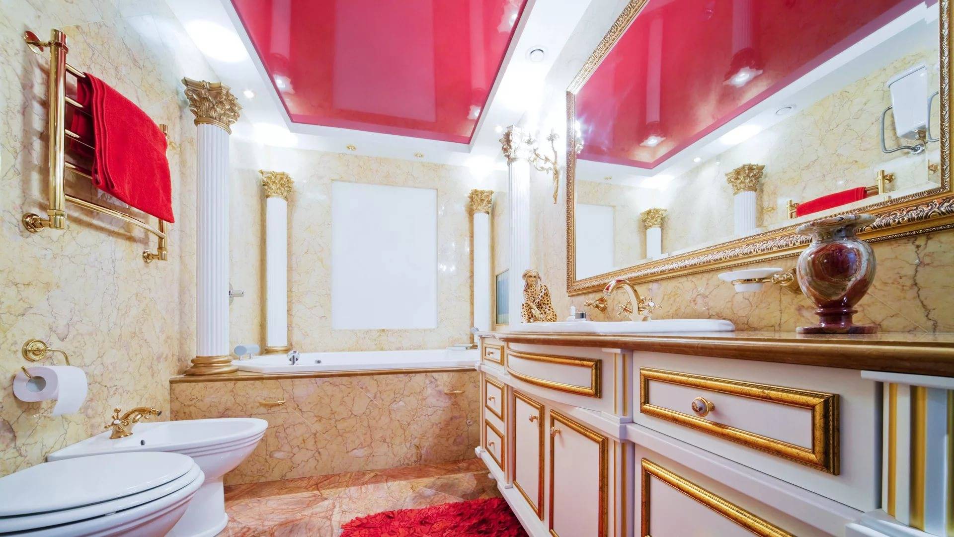 Большинство мастеров, занимающихся оформлением ванных комнат, не предлагают красный цвет для потолка. Это объясняется особенностями цвета страсти, крови и знамен. Но если правильно подобрать элементы для освещения и цвет материалов для стен, можно создать отличный дизайн. С красными нельзя проводить резкий контраст. Советуют постепенные переходы, смягчающие тон потолка к полу. Причем обязательно должны присутствовать детали светлых красок и темных палитр. Например, белые и розовые рисунки на стенах, бардовые полы.