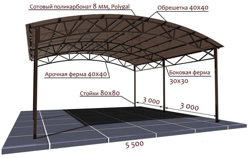 Что же представляет собой это на первый взгляд несложное строение? Состоит оно из опор и фермы, на которую устанавливаются листы полупрозрачного пластика.