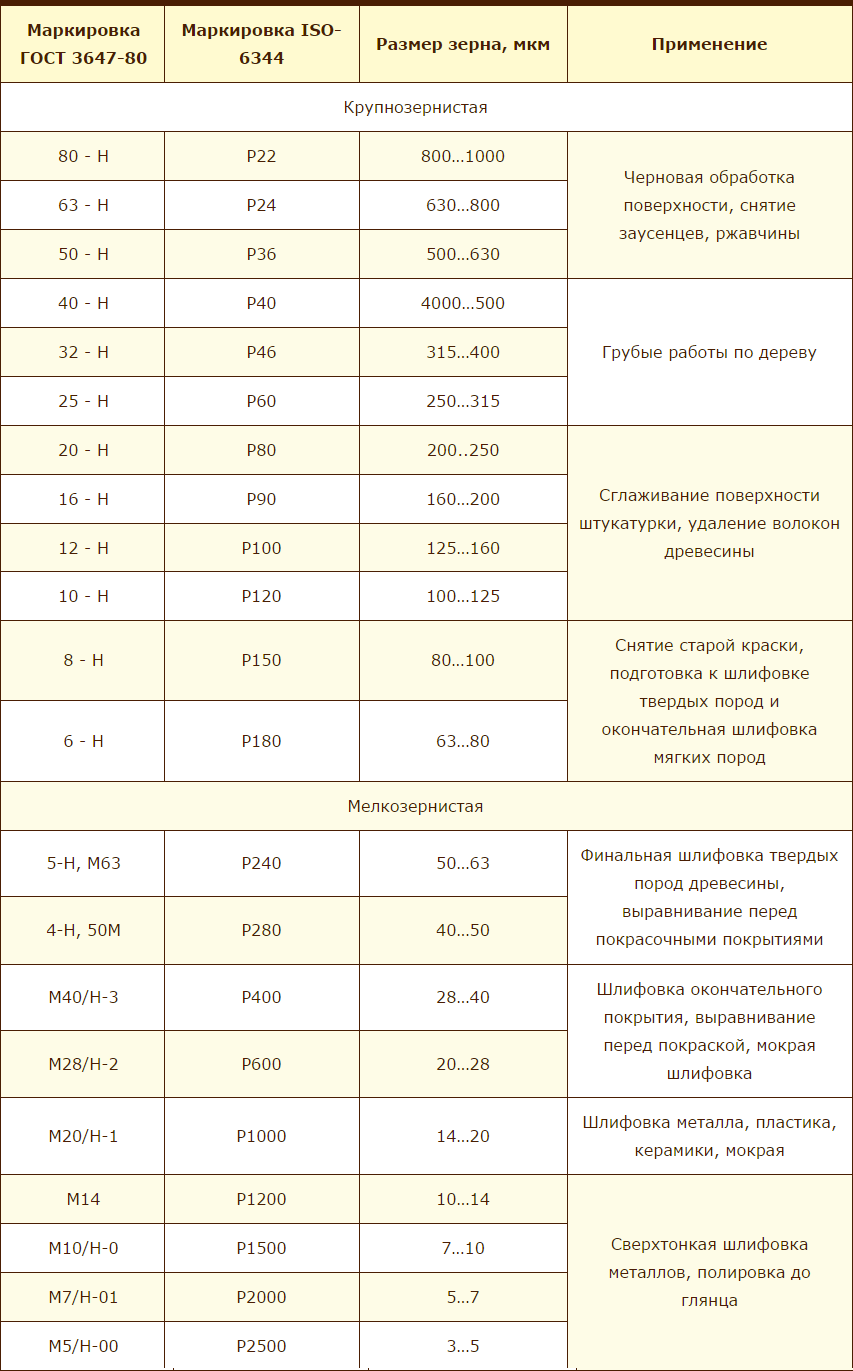 Маркировка наждачной бумаги указывает на фракцию и концентрацию абразива. Отечественный ГОСТ 3647-80 определяет количество зерен разного размера на 1 квадратную единицу, но данная классификация считается устаревшей. Сегодня шкурка шлифовальная соответствует международным стандартам ISO, именно это обозначение можно встретить на обратной стороне изделия. Следует отметить, что данные старого ГОСТа и значения международных стандартов перекликаются между собой. Их соответствие можно проследить в таблице.