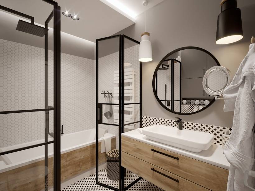 В свою очередь, ремонтируя большую ванную комнату, вы можете испытать искушение использовать контрастные цвета — разместив черно-белые плитки рядом друг с другом, вы получите эффект визуально привлекательного и хорошо развитого пространства.