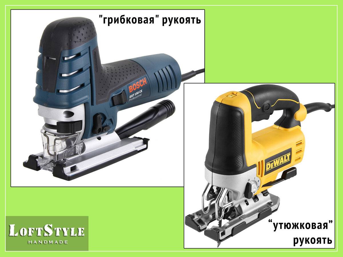 Существует два вида рукоятей для электролобзика: “грибковая” и “утюжковая”, последнюю так же называют D-образной. Утюжковая рукоять удобна для прямолинейных пропилов и для ее эксплуатации достаточно одной свободной руки. Грибковая рукоять очень удобна для при криволинейных (фигурных) пропилах, но для ее использования желательно иметь свободными обе руки.