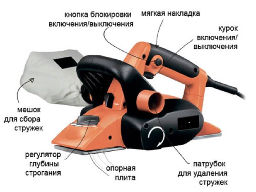 Основные узлы данного инструмента – корпус, электромотор, вал с ножевыми резцами, опорная плита (подошва), задняя и передняя рукоятки, регулятор глубины строгания, курок включения и кнопка блокировки включения и отключения. На корпусе располагается патрубок для отвода стружки в мешок.