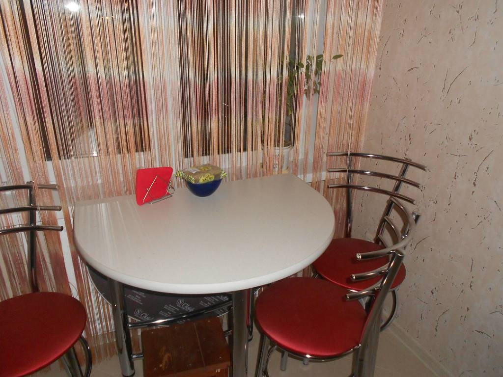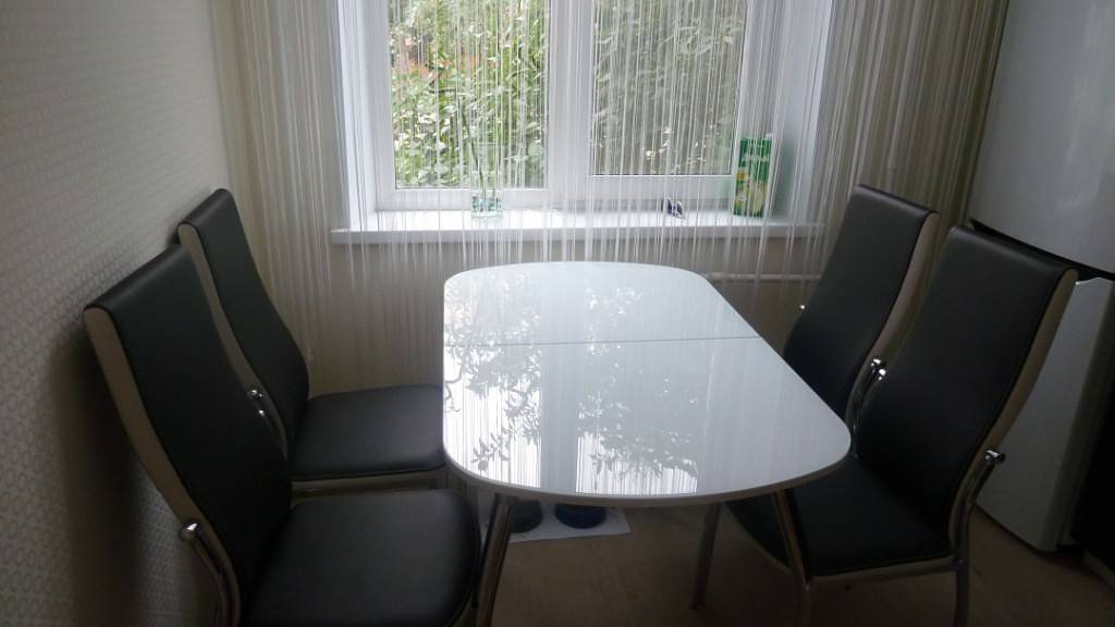 Полукруглая форма стола еще более функциональная, чем предыдущая модель. Достоинства полукруглой формы добавляются еще и значительной экономией места, что является актуальным для маленькой кухни. Полукруглый стол приставляется вплотную к стене, за счет этого занимает минимум места.