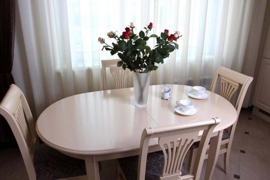 Овальная форма обеденного стола — более габаритная модель, поэтому является не лучшим вариантом для маленькой кухни. Позволит разместить всю семью и гостей, но будет занимать много места, сделает кухню неудобной.
