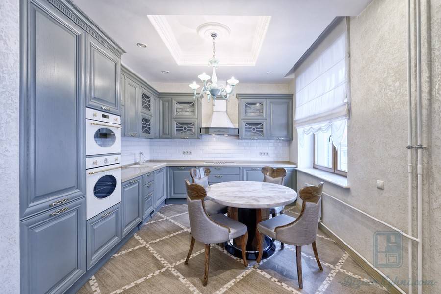 Круглая форма обеденного стола — крайне удачный выбор для кухни с маленькой площадью. Идеальным вариантом будет расположить такой стол в центре помещения. За счет круглой формы он будет наиболее функциональным и позволит разместить за ним целую семью.