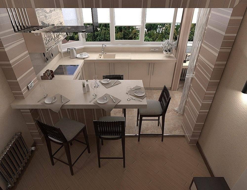 - Полностью соединить кухню с балконом (оставшийся простенок под разобранным подоконником можно использовать для устройства барной стойки);