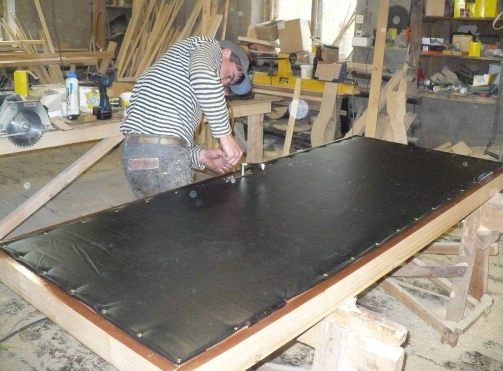 Снимается полотно и ложится на любую основу, лучше всего на четыре табурета. Удаляется вся фурнитура, обшивка (если есть), замки.