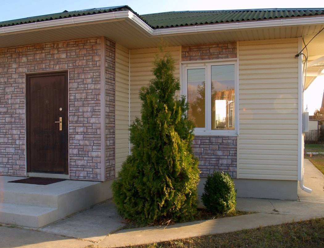Для облицовки цоколя используют сайдинговые панели, предназначенные для этих работ. Преимуществом такого фасада является: