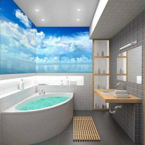 При создании дизайна ванной комнаты необходимо учитывать и практичность использования влагостойких полотен. Можно выделить несколько основных участков: