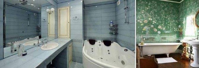 Наиболее часто встречаются обои в ванной комнате, имеющей смысловое объединение со спальной комнатой, то есть помимо джакузи в ней расположен туалетный столик с зеркалом или трюмо. Само собой, площадь такой ванной комнаты — не стандартные несколько квадратных метров «советских» квартир.