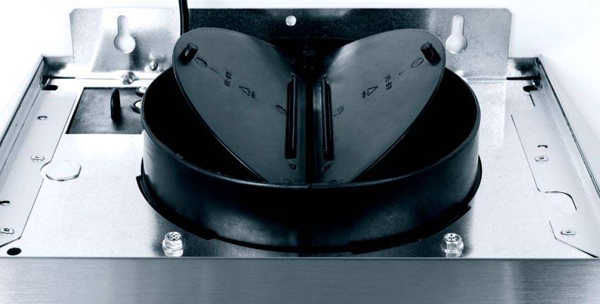 - Для подключения кухонной вытяжки используйте «хлопушку» гравитационного действия, соответствующую по форме воздуховода. Задача этого клапана – сохранение естественного воздухообмена во время бездействия вентилятора.