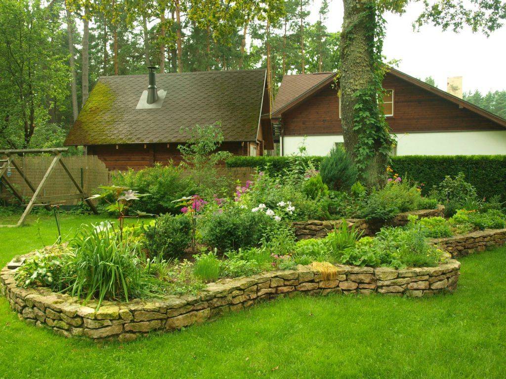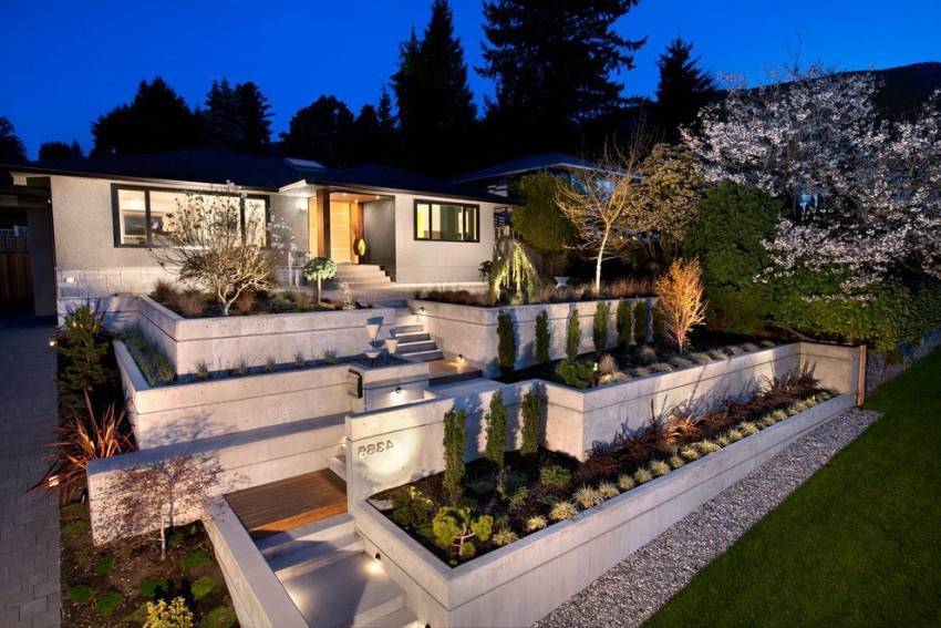 Рельеф может помочь решить проблему с зонированием. Возведение подпорных стенок на разноуровневом участке и отделка их, например, камнем, выглядит очень стильно и по-южному.