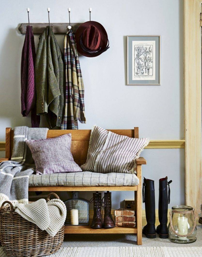 Для деревенского кантри прекрасно подойдут ретро-галошницы из натурального, плохо отесанного дерева в светлых тонах или кованые металлические стойки простой геометрической формы. Главное, чтобы мебель была максимально комфортабельной и функциональной.