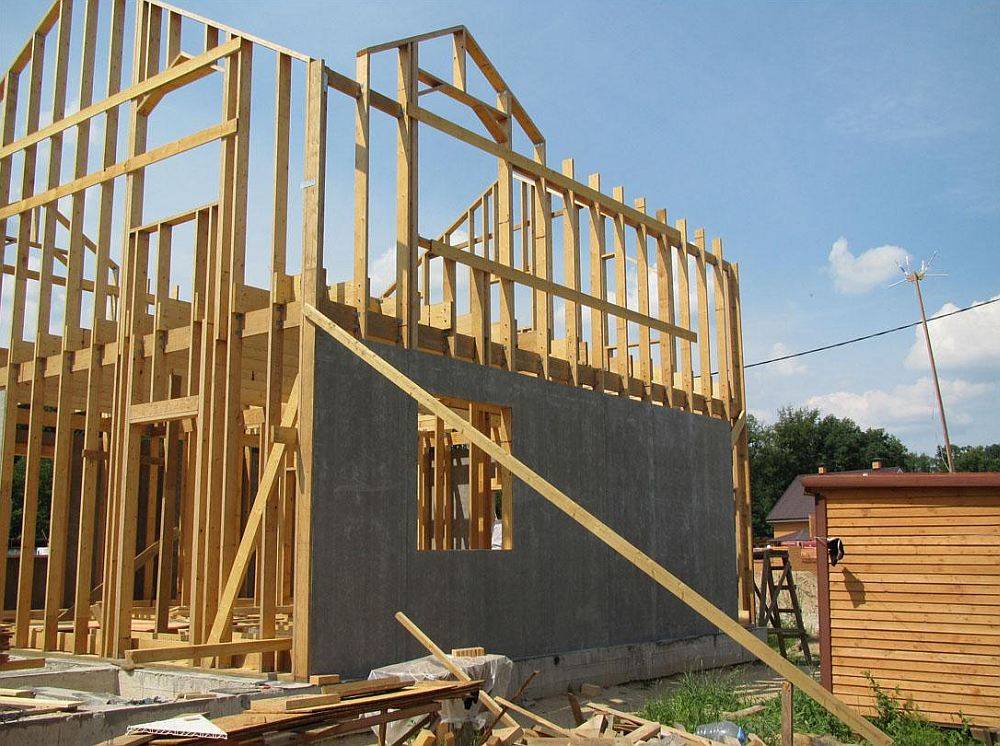 Основная особенность каркасного домостроительства заключается в использовании для основы элементов стен и перекрытий – бруса и металлопрофиля. В качестве наполнения – разные утеплители (минвата, пенопласт), которые закрываются изнутри и снаружи различными панелями – деревянными, металлическими, пластиковыми или комбинированными. Конструкция постепенно монтируется на фундаменте и параллельно обшивается – с внутренней стороны и с внешней. Это позволяет возводить здания небольшим бригадам рабочих – от двух человек, а также не использовать строительную технику – всё делается вручную.