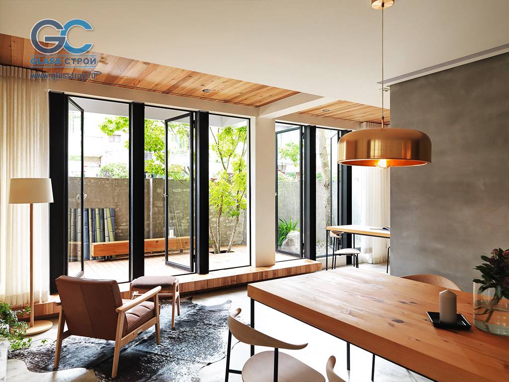 Для остекления широких проемов (до 6 м) без дорогостоящих импостов используется система «гармошка». Такие двери экономят полезное место на веранде, но они чаще ломаются, могут расшататься от частых сильных ветров и неправильной эксплуатации.