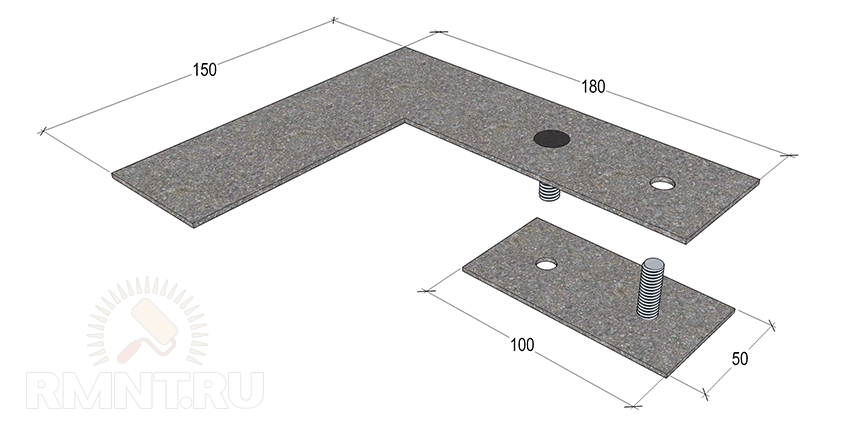 Плашку, предназначенную для фиксирования вертикальной резьбовой шпильки, необходимо просверлить насквозь сверлом 6,5 мм. Отверстие должно располагаться на расстоянии 15 мм от края плашки, примерно по центру.