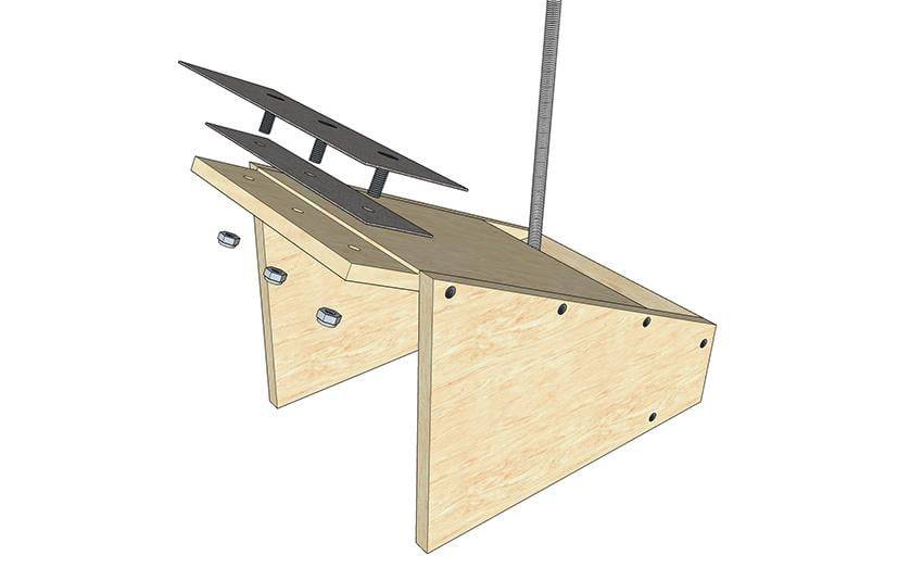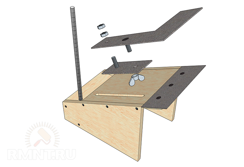 После подготовки и укомплектования материалами можно приступать к процессу сборки приспособления. В первую очередь берем фанеру для использования в качестве станины, которая должна опираться на крепежные ножные под определенным углов в диапазоне от 15 до 20 градусов. После этого в нижнюю часть, закручивается подготовленная нами шпилька, ее длина должна составлять примерно 35-40 см. Чтобы посадочную резьбу сделать более прочной можно использовать клей или герметик.