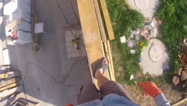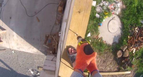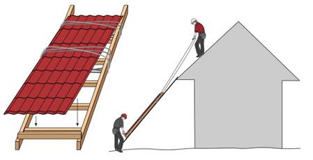 Профнастил можно поднимать по лестнице. Для этого нужно предусмотреть страховочные пояса из верёвки и проволоки, чтобы листы не сдувало ветром