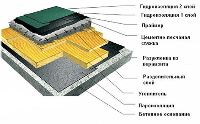 Поэтому для них вначале выполняется первичная гидроизоляция поверх ровной поверхности (плиты или сплошного настила на балках перекрытия), потом монтируется утеплитель под стяжку, далее – еще два или более слоев гидроизоляции.