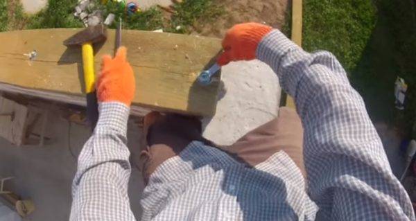 Далее к мауэрлату фиксируются стропильные ноги. Самый доступный метод — два скрещённых гвоздя длиной более 15 см или скобы из металла. Затем выполняется разметка стропил: