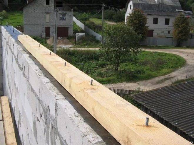 К бетонным или каменным стенам мауэрлат крепится при помощи заранее установленных шпилек с резьбой