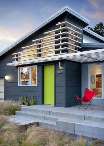 Односкатные крыши гармоничны в сочетании с наклонными навесами. Это позволяет выгодно подчеркнуть некоторые части дома, сделать акцент на дизайне входной группы. Стильно смотрятся дополнения в виде козырьков, словно невесомых пристроек, навесов с покрытием из поликарбоната или профнастила.