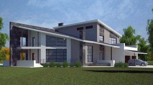 Частный двухэтажный каменный дом в современном стиле. Отсутствие конька позволяет без проблем возводить многоуровневые системы. Четкие горизонтальные линии фасада прекрасно рифмуются с дуэтом односкатных крыш. Этот же прием прекрасно подойдет для Г-образного основания из пеноблоков.