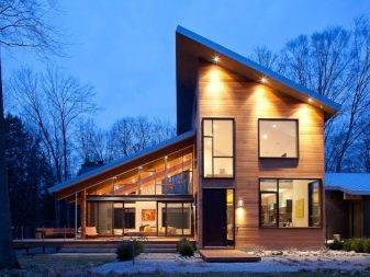 Односкатные крыши считаются самими недорогими и простыми в устройстве. И это действительно так, особенно при небольшой ширине здания. Тем не менее, в нашей стране дома с односкатными крышами встречаются совсем нечасто. По большей части это связано с тем, что более привычны для нас двух или четырех скатные кровли — они выглядят привычнее. Вторая загвоздка — найти проект, адаптированный под наши погодные условия. На западных ресурсах проектов очень много, но они разработаны под более мягкий климат, как правило, имеют большую площадь остекления. Найти архитектора, который грамотно изменит понравившийся проект очень непросто. Но если все-таки удалось, и при этом не нарушилась гармония здания, дом получается очень оригинальный.