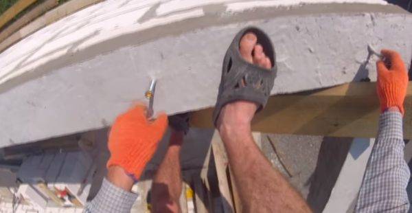 Обрешётка выполняется снизу вверх. Каждый брус закрепляется на один гвоздь или скобу. Фиксация производится прямо к стропильной ноге. Далее монтируются вспомогательные свесы, под которые подкладывается рубероид. Это позволит защитить элементы от сырости. В дальнейшем свесы будут зашиты сайдингом.