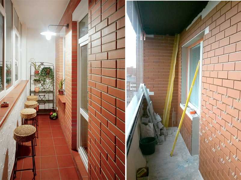 Второй по популярности материал — декоративный камень или клинкерная плитка под кирпич. Отделка балконов внутри этими материалами возможна и при холодном, и при теплом остеклении, а также вообще без него. Материал долговечен, легок в уходе, морозостоек, не разрушается под действием ультрафиолета. Так что неплохой выбор.