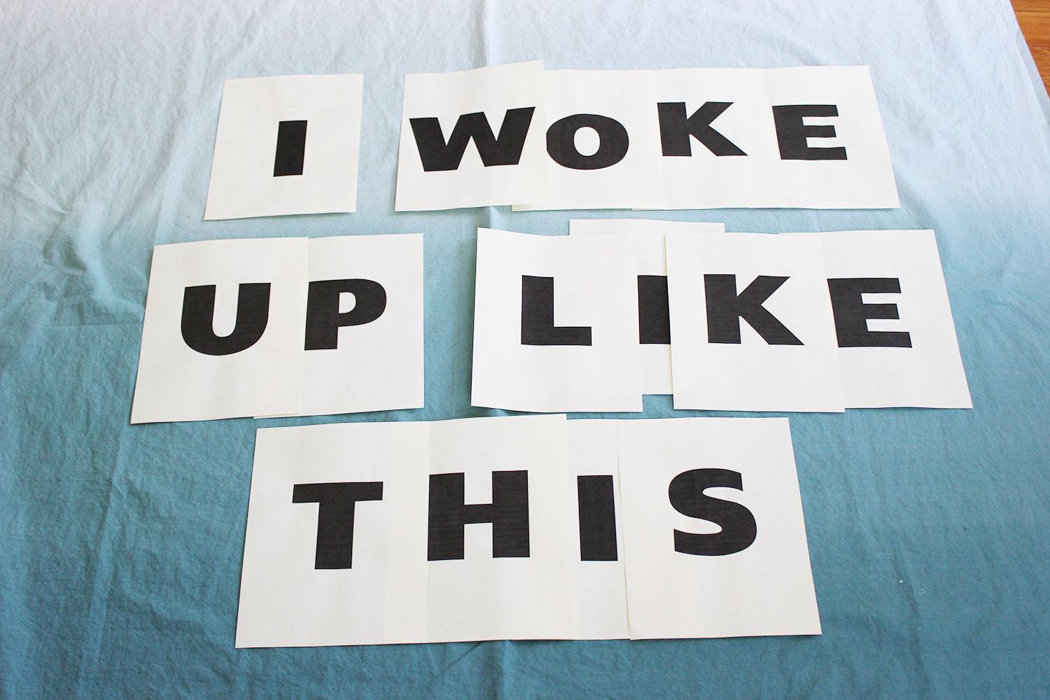 Для начала подберем необходимую фразу для шторки. Печатаем каждую букву отдельно на листах формата А4. Расстилаем шторку и кладем поверх нее листы с буквами в несколько рядов.